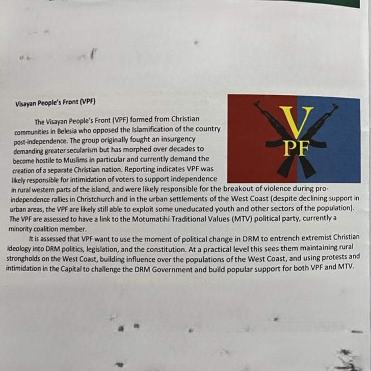 The NZDF  Burnham Military Camp Training Course for Junior Non-Commissioned Officers. The  Fictitious Christian enemy (VPF The Visayan Peoples Front) The island  where they lived -given a fictious name (Belisia). Which resembled (mirrored) the South Island of NZ                                                                                                               .The Christian Community defending their Faith against Islamization. Shoot To Kill The Enemy On Sight – Christians with Traditional Values are the Adversary Enemy.